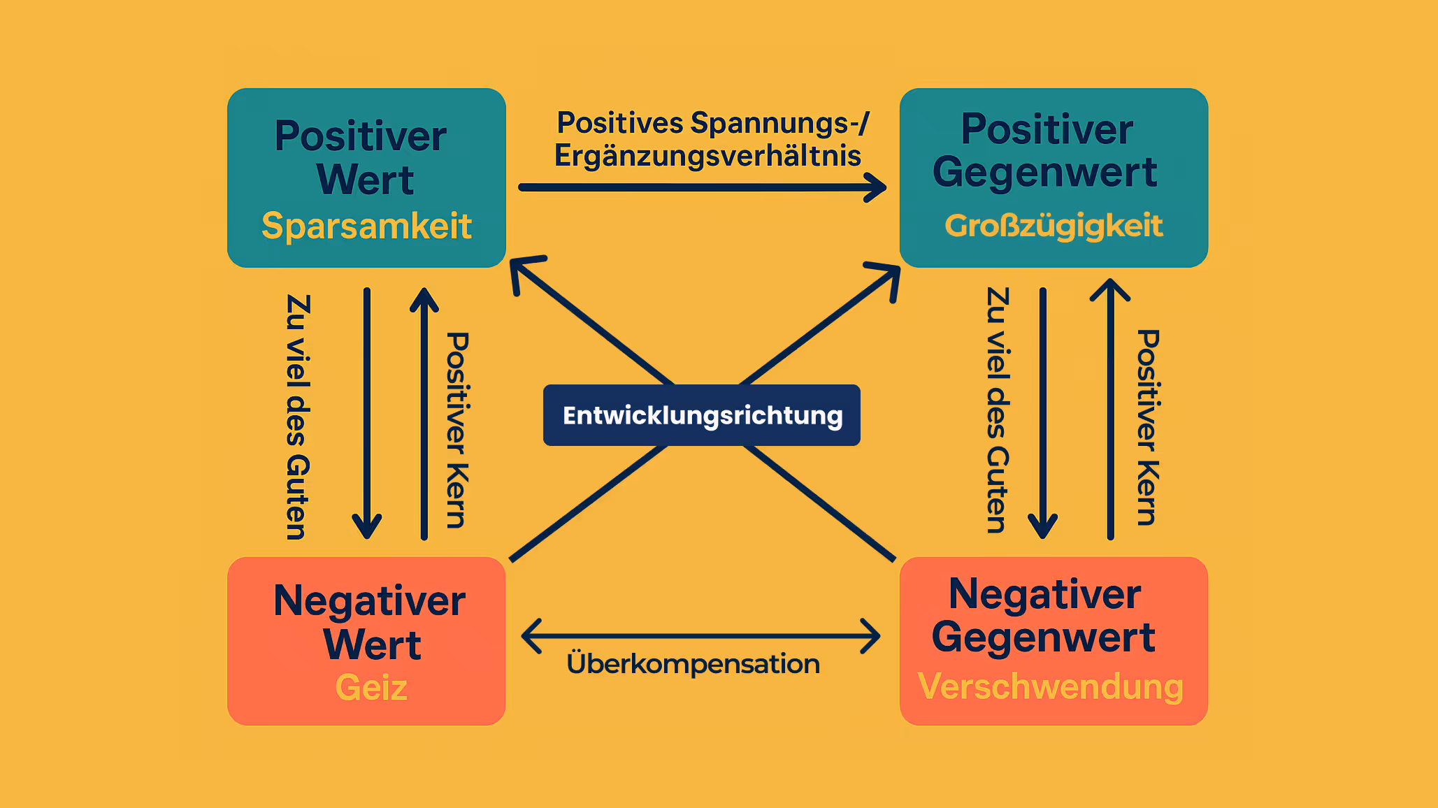 Die Prämisse des Werte- und Entwicklungsquadrats lautet: Jeder Wert (jede Tugend, jedes Leitprinzip, jede menschliche Qualität) kann nur dann seine volle konstruktive Wirkung entfalten, wenn er/sie sich in ausgehaltener Spannung zu einem positiven Gegenwert, einer „Schwesterntugend” befindet. Ohne diese Balance verkommt ein Wert zu seiner entwerteten Übertreibung. Ich habe für verschiedene Anwendungen daraus ein "Kochquadrat" oder "Problemquadrat" weiter entwickelt.